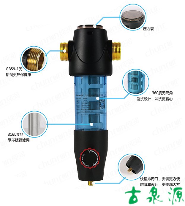 1.排污手柄結(jié)合人體工程學(xué)和視覺美學(xué)完美設(shè)計融合,更美觀實(shí)用 2.純潤藍(lán)半透明杯體,有效減少光線進(jìn)入,減少藻類滋生 3.日期刻度記憶功能,方便安全 4.超大杯體,瞬間出水量更大 5.防水錘沖擊設(shè)計,更安全 6.標(biāo)配一寸轉(zhuǎn)6分活接頭 7.5T/小時大流量