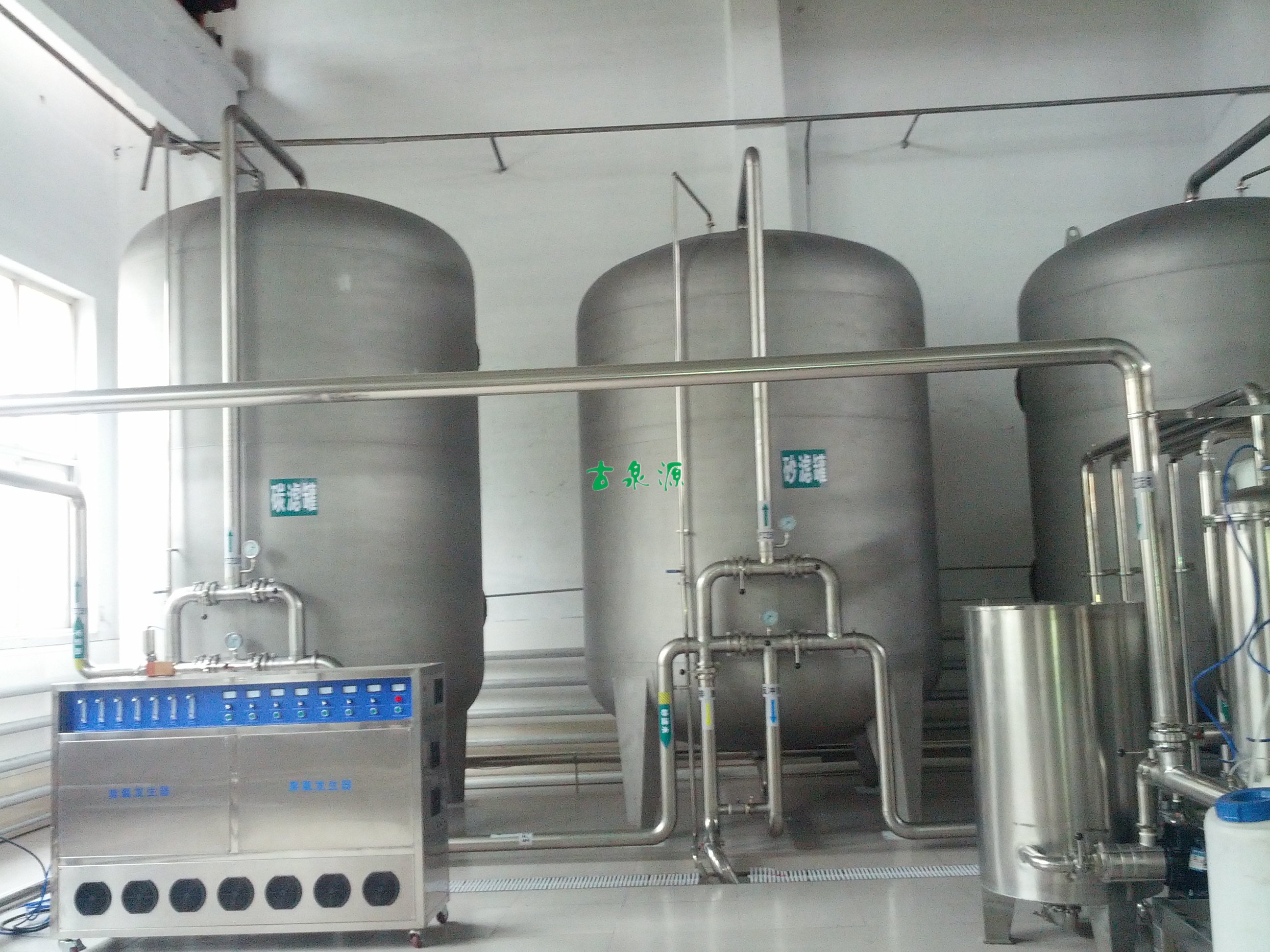 該公司為某大型桶裝水廠的純凈水設(shè)備,出水要達(dá)到國家桶裝水的標(biāo)準(zhǔn)。我們給設(shè)計(jì)了反滲透凈水方案,前期預(yù)處理為錳沙和活性炭,并且為反滲透膜配備了加藥(阻垢劑)系統(tǒng),以保護(hù)膜并延長其使用壽命。自動(dòng)控制方面采用了西門子PLC并配備了人際界面進(jìn)行操作。整套設(shè)備的運(yùn)行使用方面無需任何手動(dòng)操作。真正實(shí)現(xiàn)了量產(chǎn)飲用水的目的。